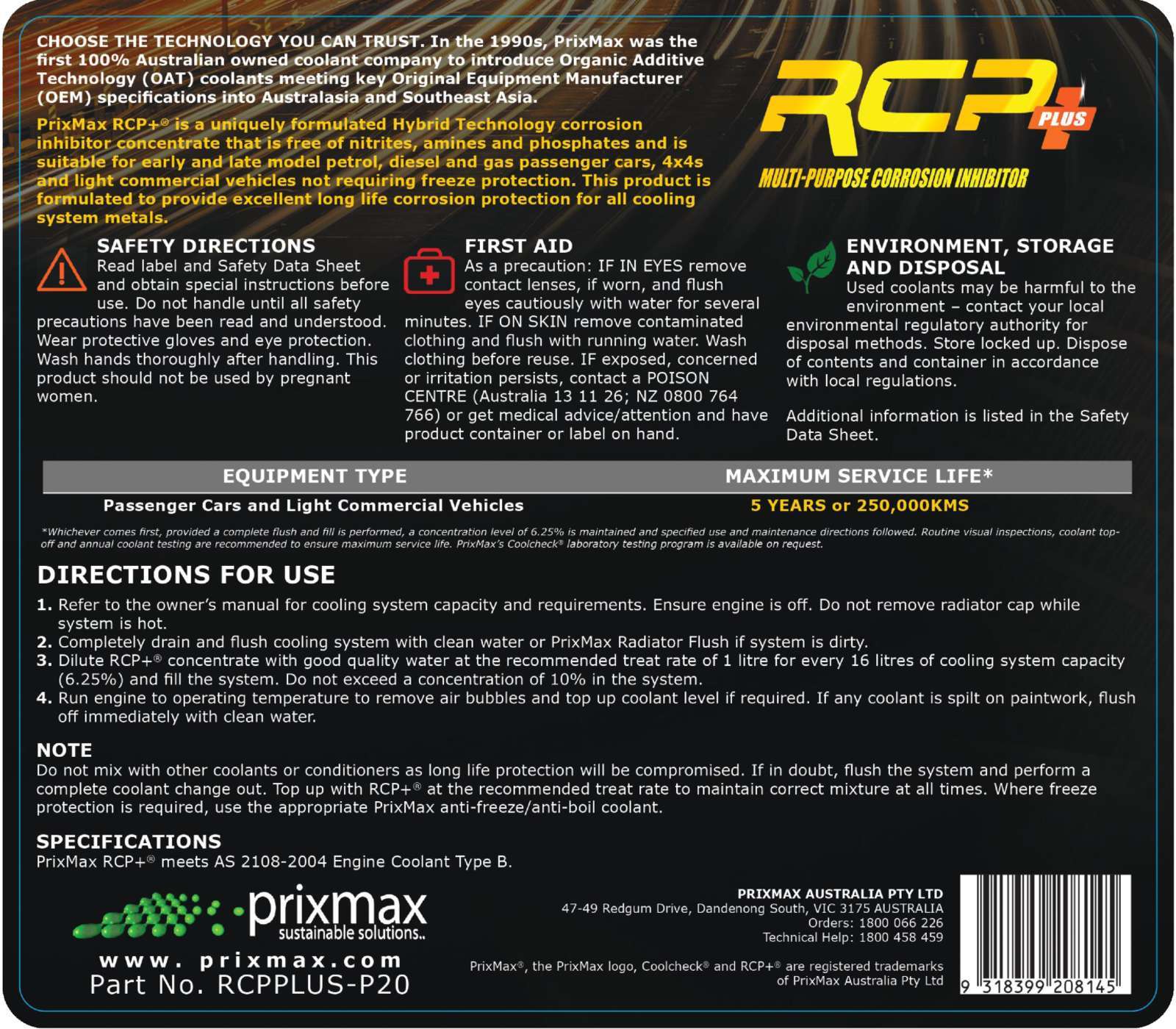 Fully warrantedPrixMax RCP+ is a low toxic, environmentally friendly inhibitor concentrate made in Australia for Australian conditions. RCP+ provides excellent protection of engine cooling systems. Using proprietary silicate-free organic carboxylate technology (OAT) the product provides long life corrosion protection for aluminum, iron, copper and solder alloys. The inhibitors contained in PrixMax RCP+ have very low depletion rates unlike the traditional nitrite and silicate based technologies.